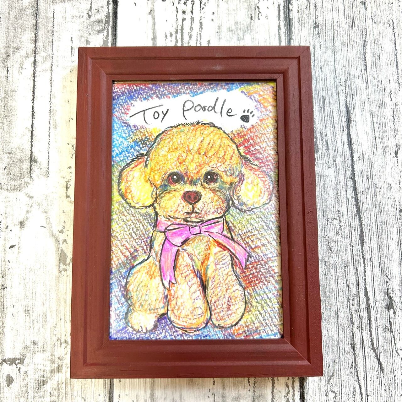 ペット似顔絵師がハガキサイズの画用紙に、カラフルな油彩蛍光色鉛筆で虹色のトイプードルを描きました。
