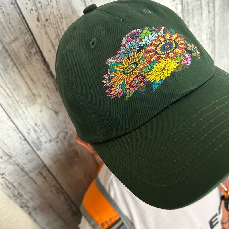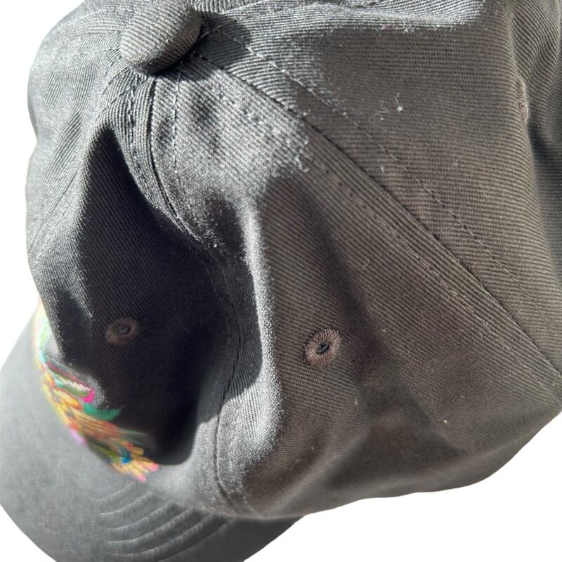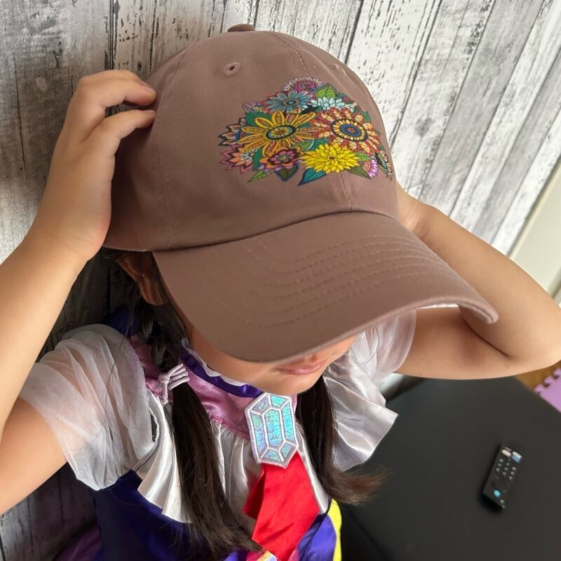 アジアンフラワーをイメージした花柄のトライバルデザインに隠れ黒猫ちゃんのイラストのコットンツイルキャップをお作りしました。